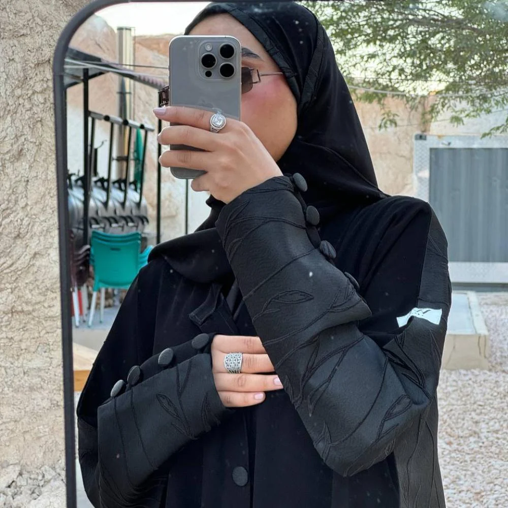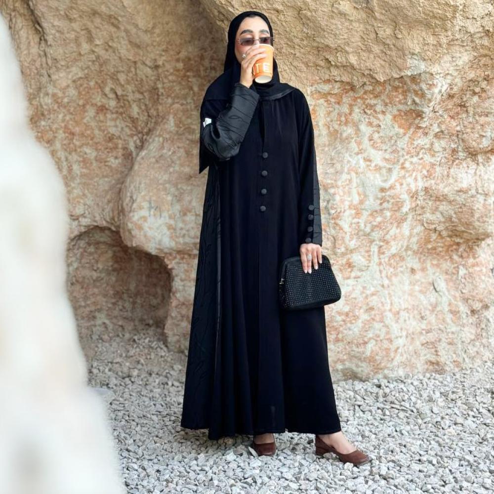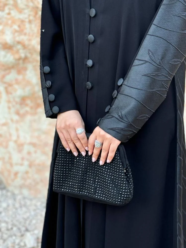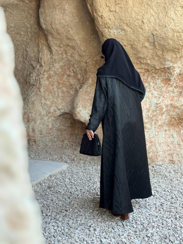 عباية كريب سواد فاحم بلمسة نص جاكار شتوي مطرّز، بقصّة نص كلوش تعطي أناقة وانسيابية. أكمامها نص جاكار مع أزرار بتفاصيل راقية، وتجي معها طرحة سادة بطرف من نفس القماش لإطلالة متكاملة.