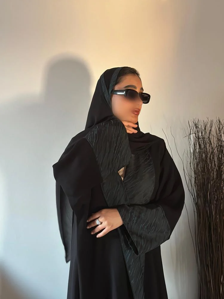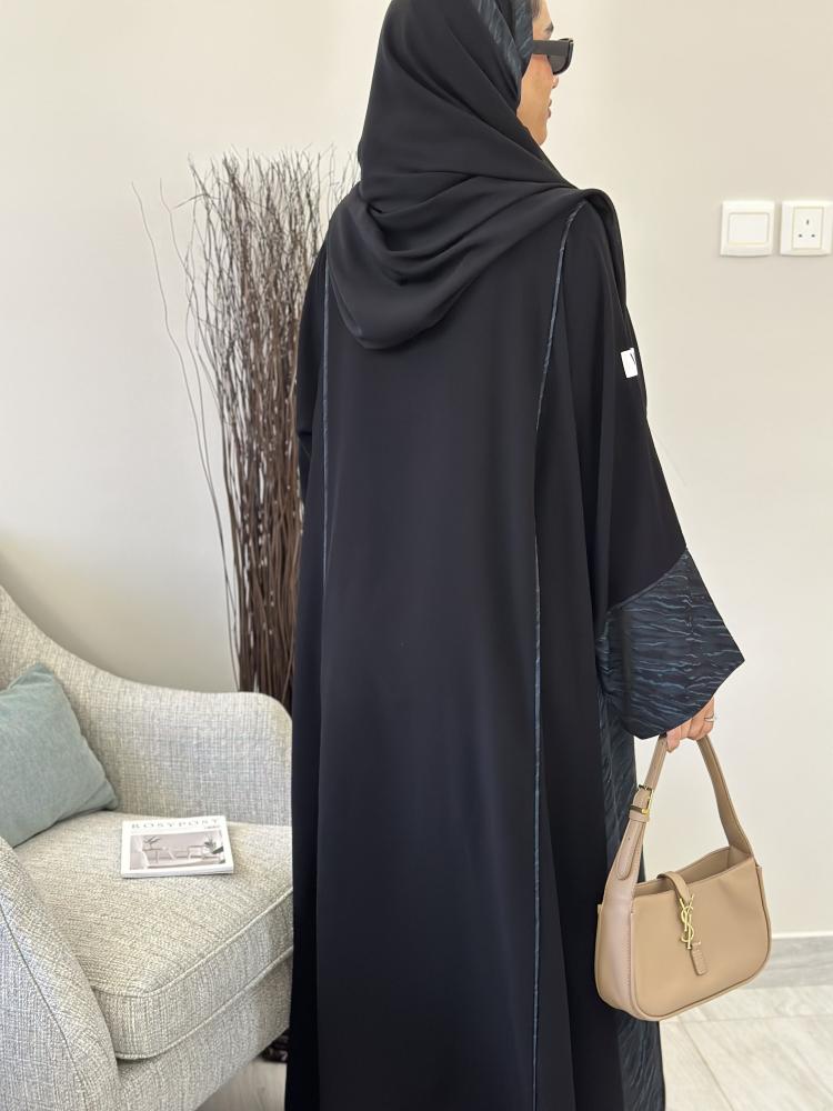 عباية صيفية من كريب ملكي خفيف، تجمع بين الراحة والأناقة. الأكمام مصمّمة من قماش الجاكار باللون التركواز لإضافة لمسة فخمة، ومع زيجين من الأمام والخلف يمنحون العباية طابع راقٍ ومميز. مناسبة للإطلالات اليومية والمناسبات الصيفية.