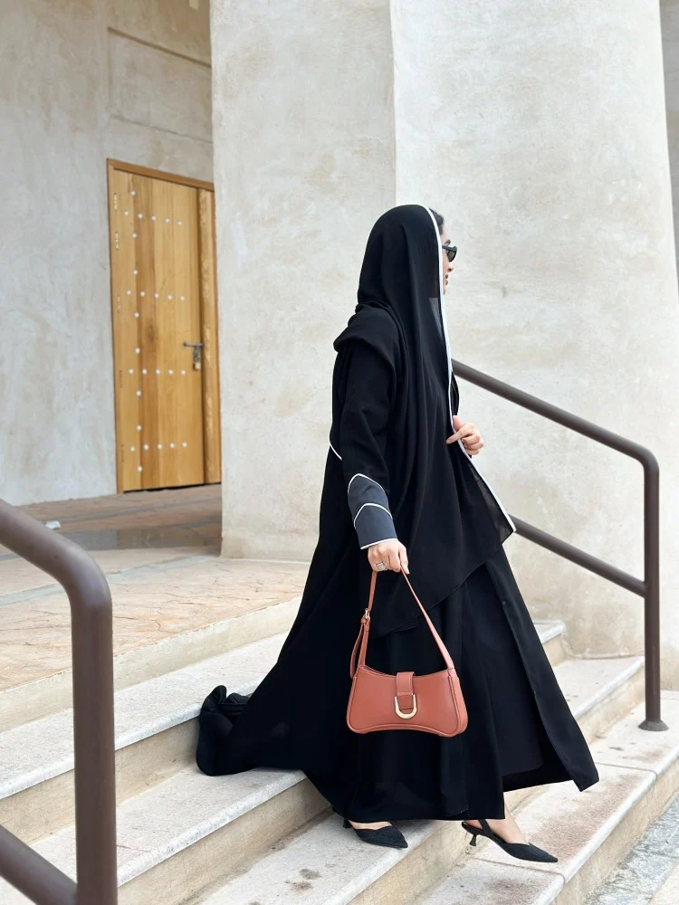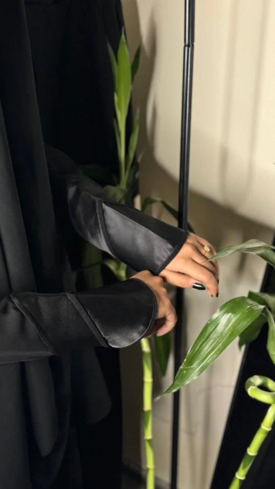 عباية راقية من قماش كريب لمياء المعروف بثباته وأناقة انسيابيته. الكم مصمم من تفـته مع زيج أبيض ويمكنك تغييره باللون اللي يناسب ذوقك ويعكس شخصيتك.